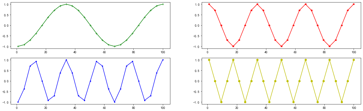 x = np.linspace(1, 100, num= 25, endpoint = True) def y_subplot(x,i): return np.cos(i * np.pi *x) #使用subplots 画图,2*2四个子图 fig,ax = plt.subplots(2,2,figsize=(20,6)) #type(f) #matplotlib.figure.Figure style_list = ["g+-", "r*-", "b.-", "yo-"] #顺序和二维矩阵取法一样 ax[0][0].plot(x, y_subplot(x, 1), style_list[0]) ax[0][1].plot(x, y_subplot(x, 2), style_list[1]) ax[1][0].plot(x, y_subplot(x, 3), style_list[2]) ax[1][1].plot(x, y_subplot(x, 4), style_list[3])