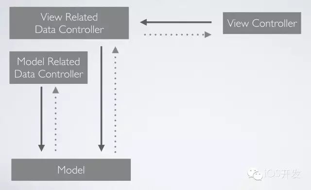 ViewController 可以向 DataController 请求获取或是操作数据,也可以将一些事件传递给 DataController,这些事件可以是 UI 事件触发的。DataController 在收到这些请求后,再向 Model 层获取或是更新数据,最后再将得到的数据加工成 ViewController 最终需要的数据返回。