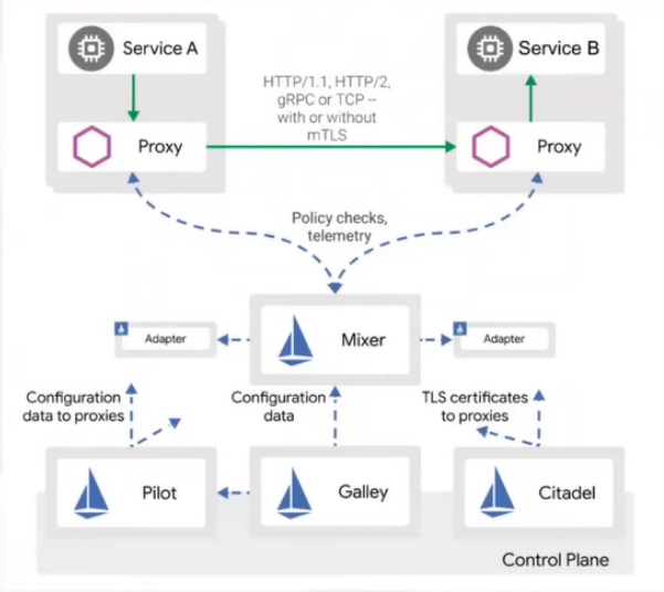 Mixer:适配组件,数据平面与控制平面通过它交互,为 Proxy提供策略和数据上报。