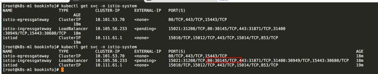 istio-ingressgateway LoadBalancer 10.107.234.243 <pending> 15020:31208/TCP,80:30145/TCP,443:31871/TCP,15029:30949/TCP,15030:30680/TCP,15031:32747/TCP,15032:30218/TCP,15443:31244/TCP 31m