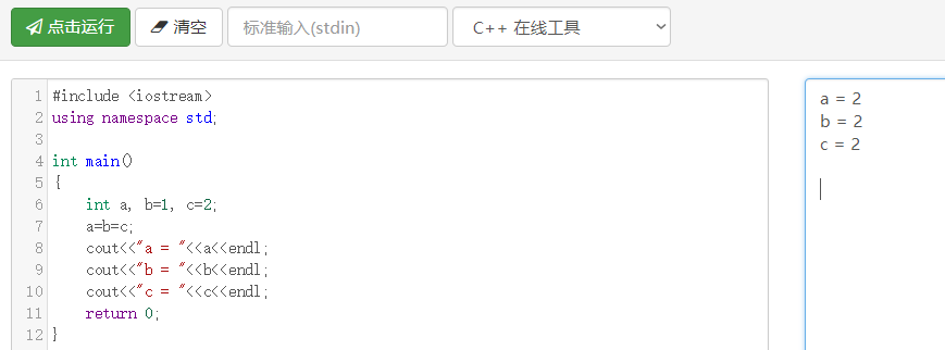 a=b=c; //这里表达式中最右边的操作最先执行,然后从右到左依次执行。先赋值给b,然后b再赋值给a,最终a的值是2。于是:a=2,b=2,c=2