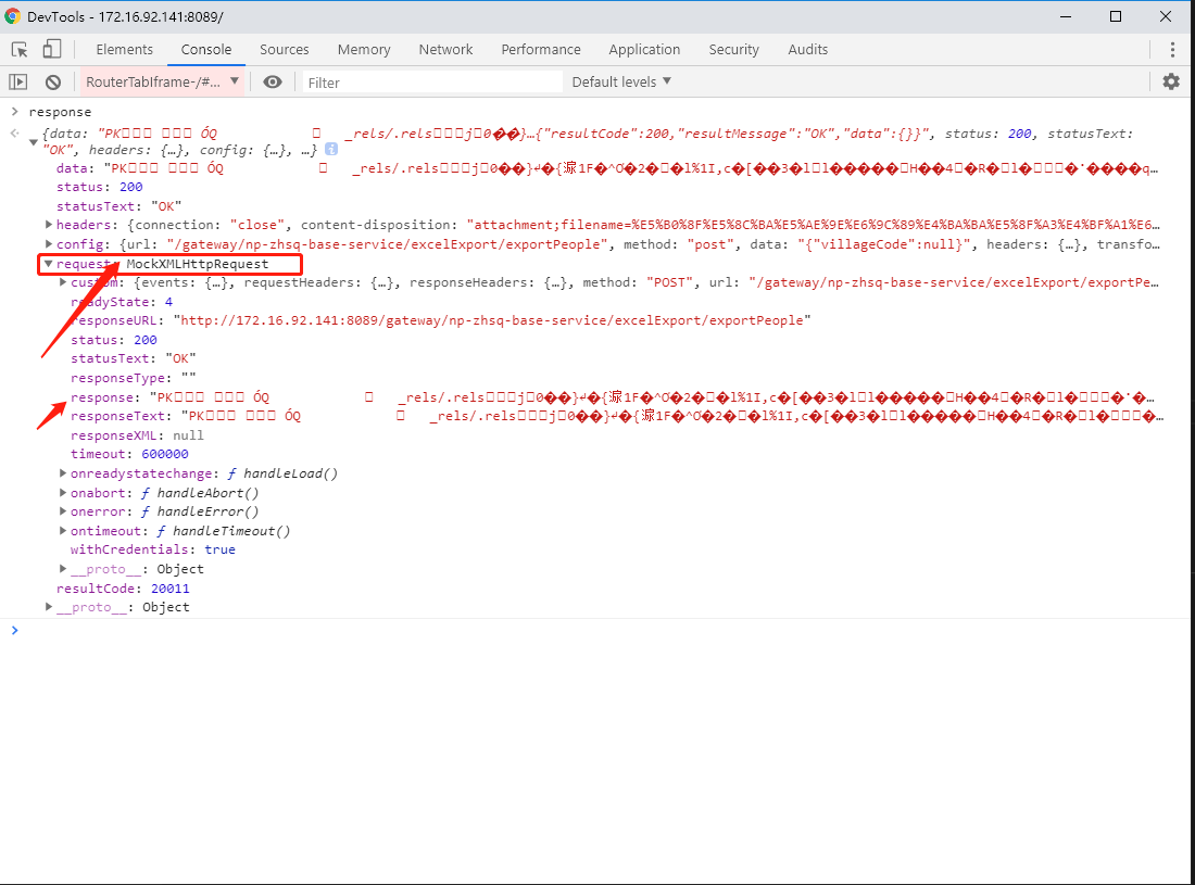 下面是mock拦截修改后的返回对象,data变成string类型,显示为乱码。返回的请求为MockXMLHttpRequest类型