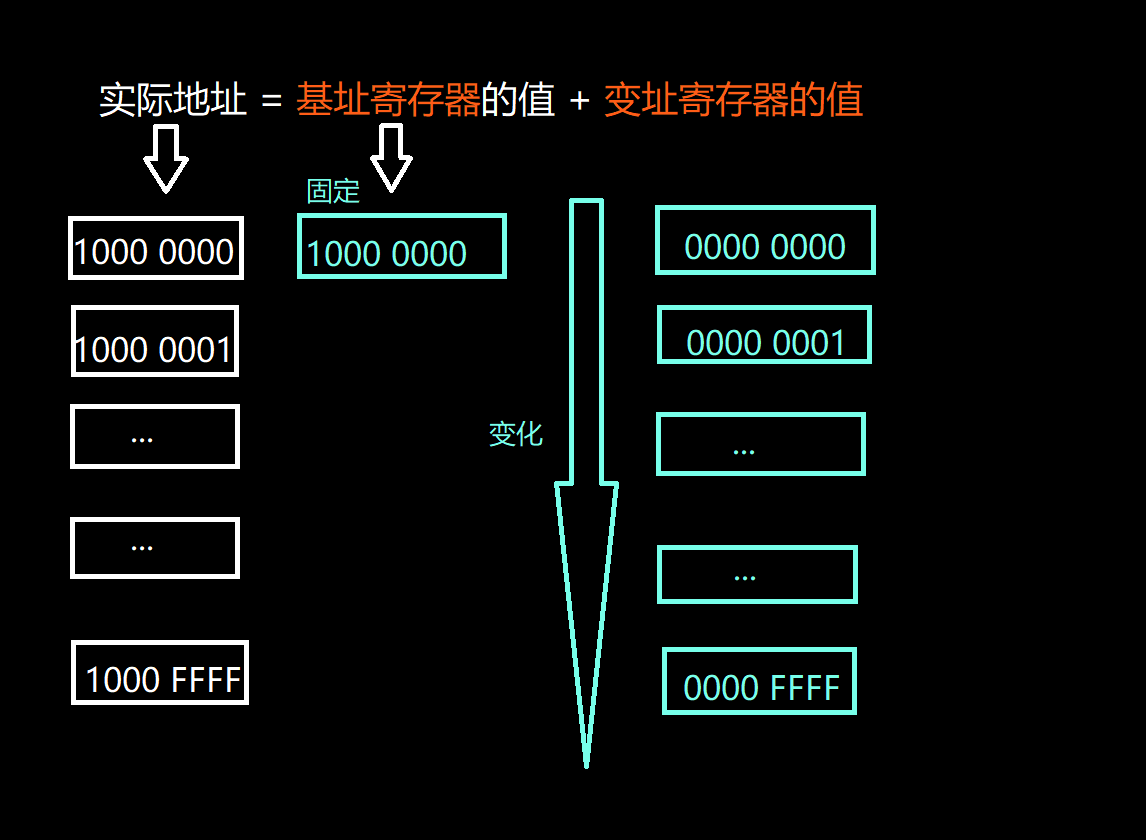 进制的表示方法:4位二进制可以表示的范围是 0000~1111 ,转化成十进制所表示的范围就是 0~16 (0 1 2 3 4 5 6 7 8 9 10 A B C D E F),其中A B C D E F这几个字母不区分大小写表示的数值是11 、12、13、14、15、16,因此1个16进制的数由4个2进制数表示。那么,在32位机器上便能够表示的内存地址就是00000000 00000000 00000000 00000000 ~ 11111111 11111111 11111111 11111111,此处为了方便沃恩用十六进制表示:0000 0000 ~ FFFF FFFF。则可以通过这种方法模拟出数组的操作:将1000 0000存入基址寄存器(固定值),将 0000 0000 ~ 0000 FFFF之间的值存入到变址寄存器中,那么基址寄存器+变址寄存器的值便是访问内存的实际地址。
