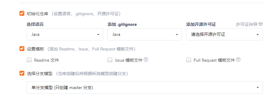 可在创建仓库时,选择如下选项,让码云自动生成.gitignore文件