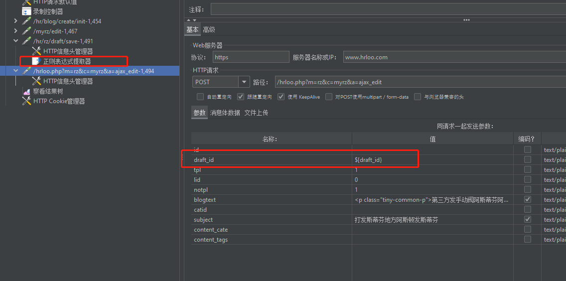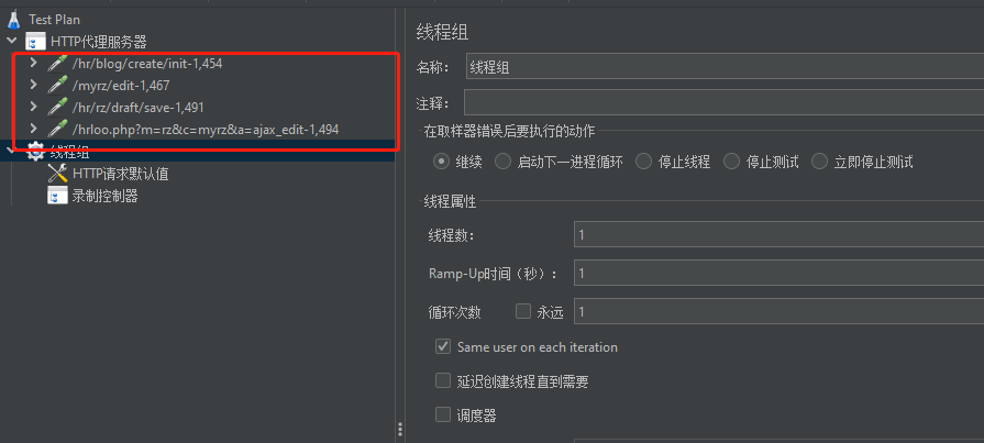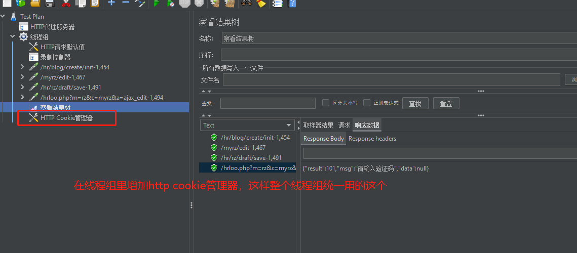 8) 录制好脚本后,需要手动把 不需要的请求给删除了, 仅保留需要的。 然后进行执行,然后调试所遇到的问题(加cookie管理器, 添加参数变量等)