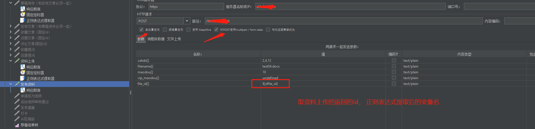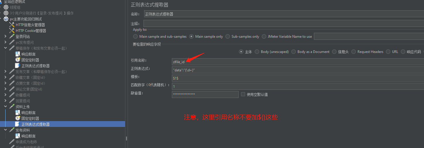 2. 正则表达式提取器中, 把引用名称写成了${zlfile_id},导致一直报错, 引用名称直接写zlfile_id 即可