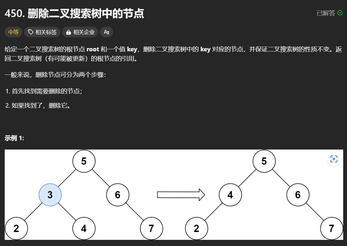 删除目标节点首先要找到该节点,因此用到搜索二叉树的性质去寻找,该节点比target大就看左子树部分,小就看右子树部分。