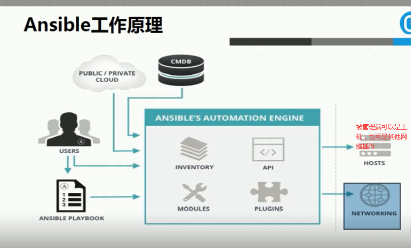 Ansible工作架构 Ansible是主控端控制别的主机,配置文件管理主机。