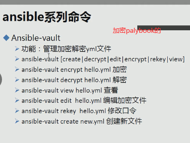 角色:很多playbook(脚本)的集合, 还可以加密 ansible-vault encrypted 文件名