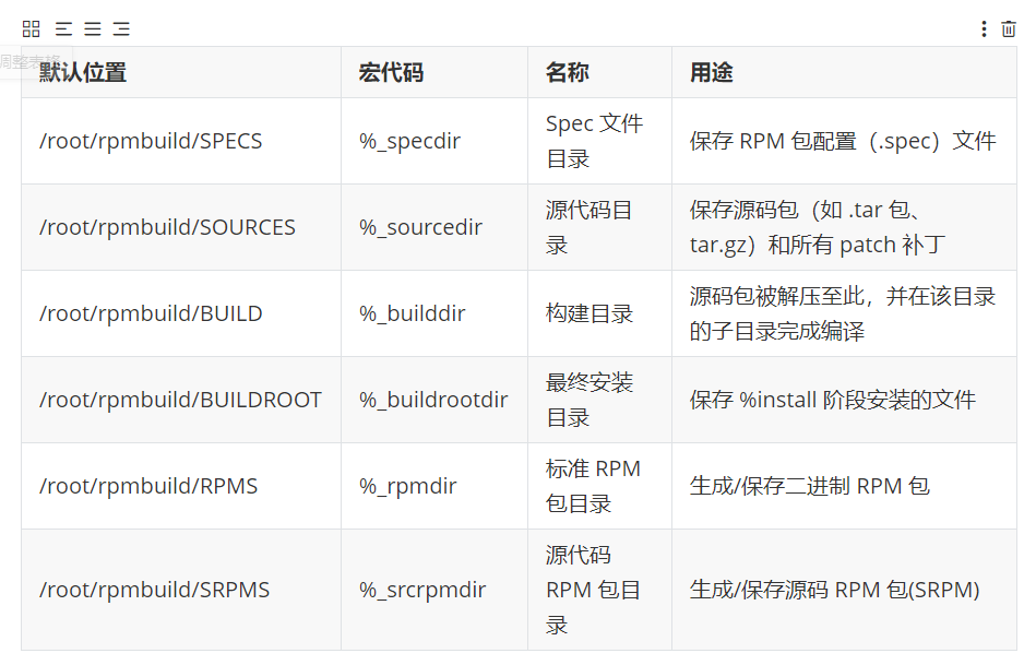 rpmdev-setuptree 生成rpm需要的环境,在/root/目录(/home)下生成rpmbuild目录,目录下各个文件夹解释参考
