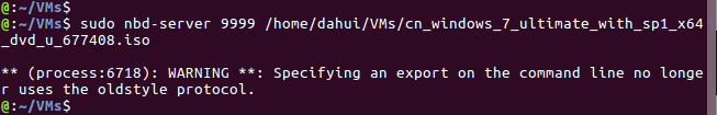 执行命令nbd-server 9999 nbd.file,将一个win7的安装镜像作为目标文件,查看nbd相关进程可以发现nbd-server已经运行起来了