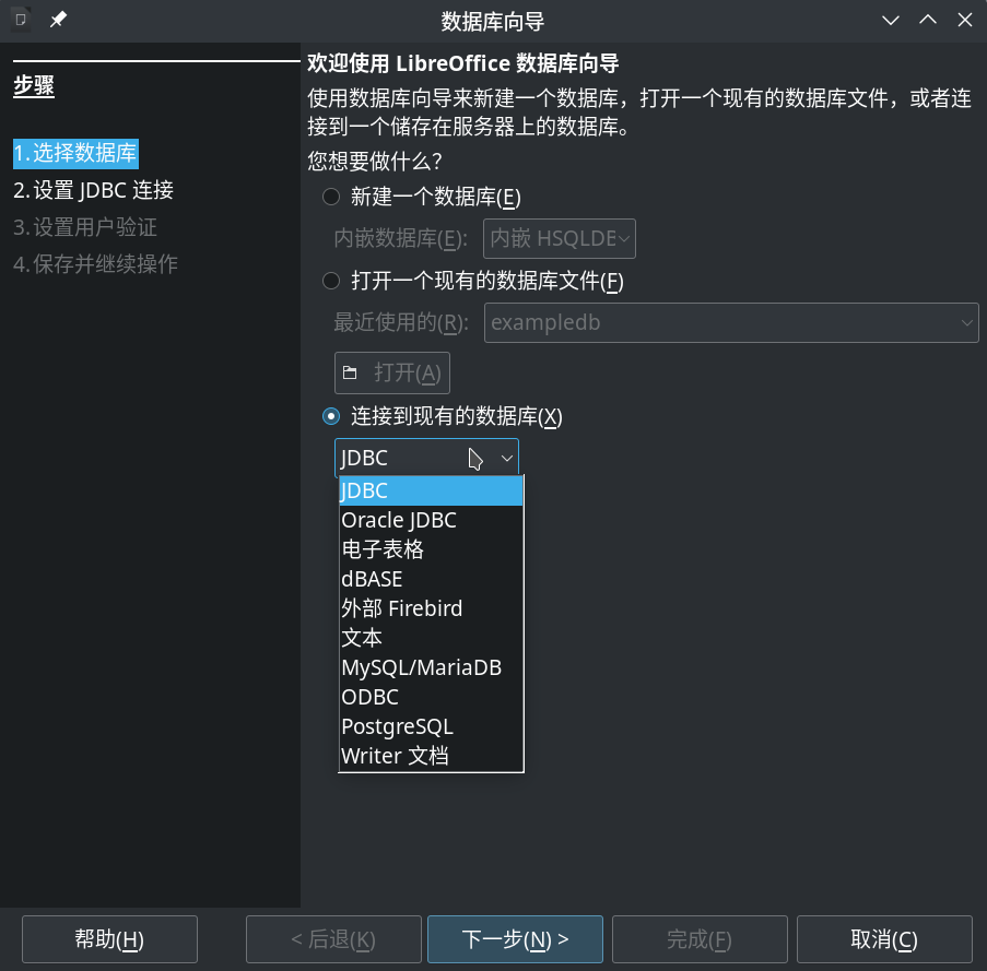 在LibreOffice Base中,提供了连接MySQL、MariaDB的选项,同时也有通过JDBC的选项。