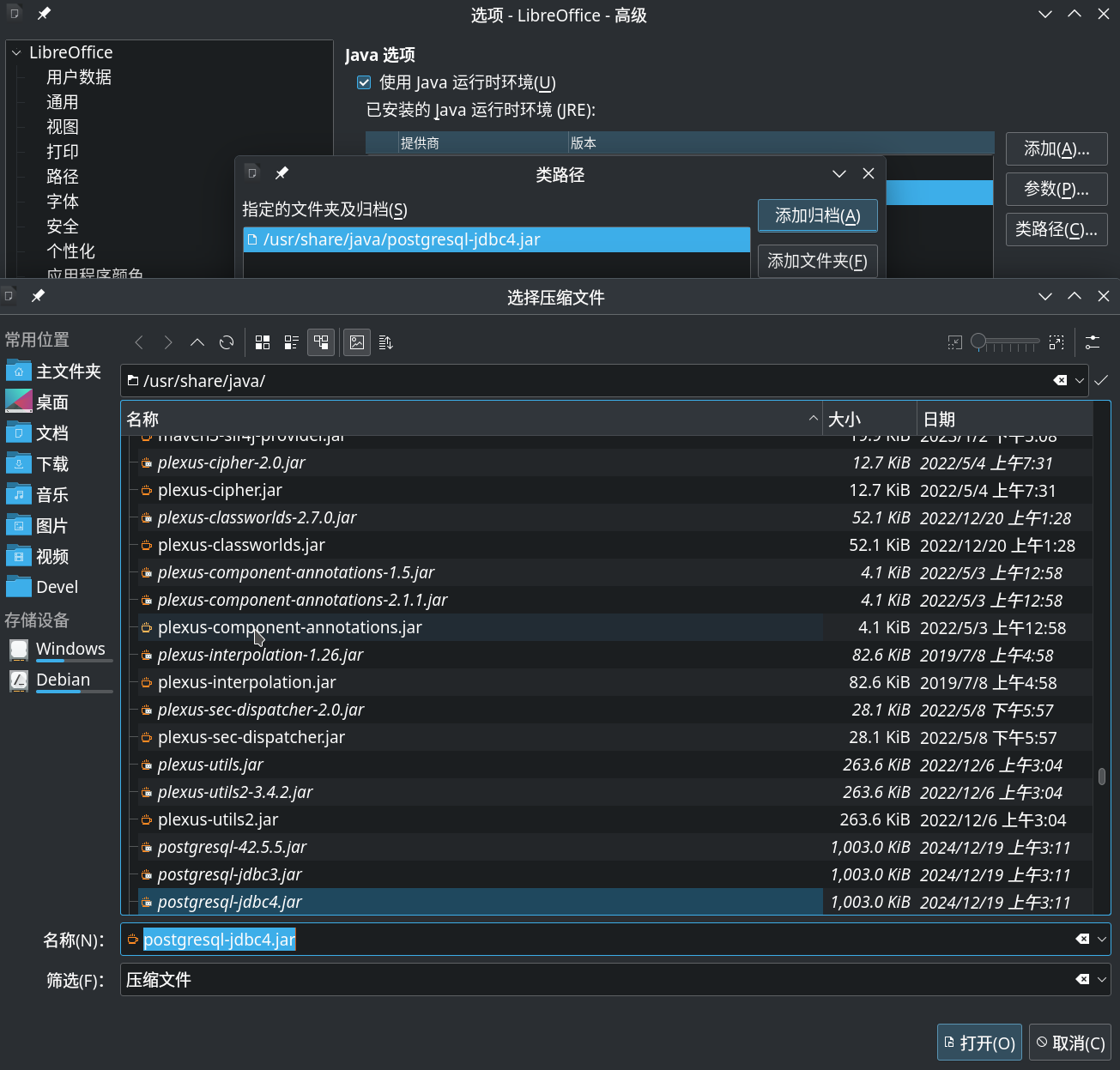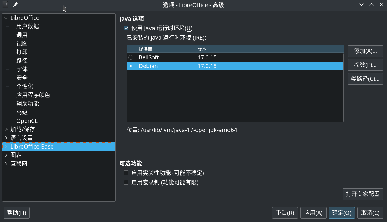 确保无误后,在LibreOffice Start Center中的【工具】>【选项】>【LibreOffice】>【高级】里面设置使用Java运行时环境,如果没有的话点击【添加】来添加你的设备上JDK的安装路径。
