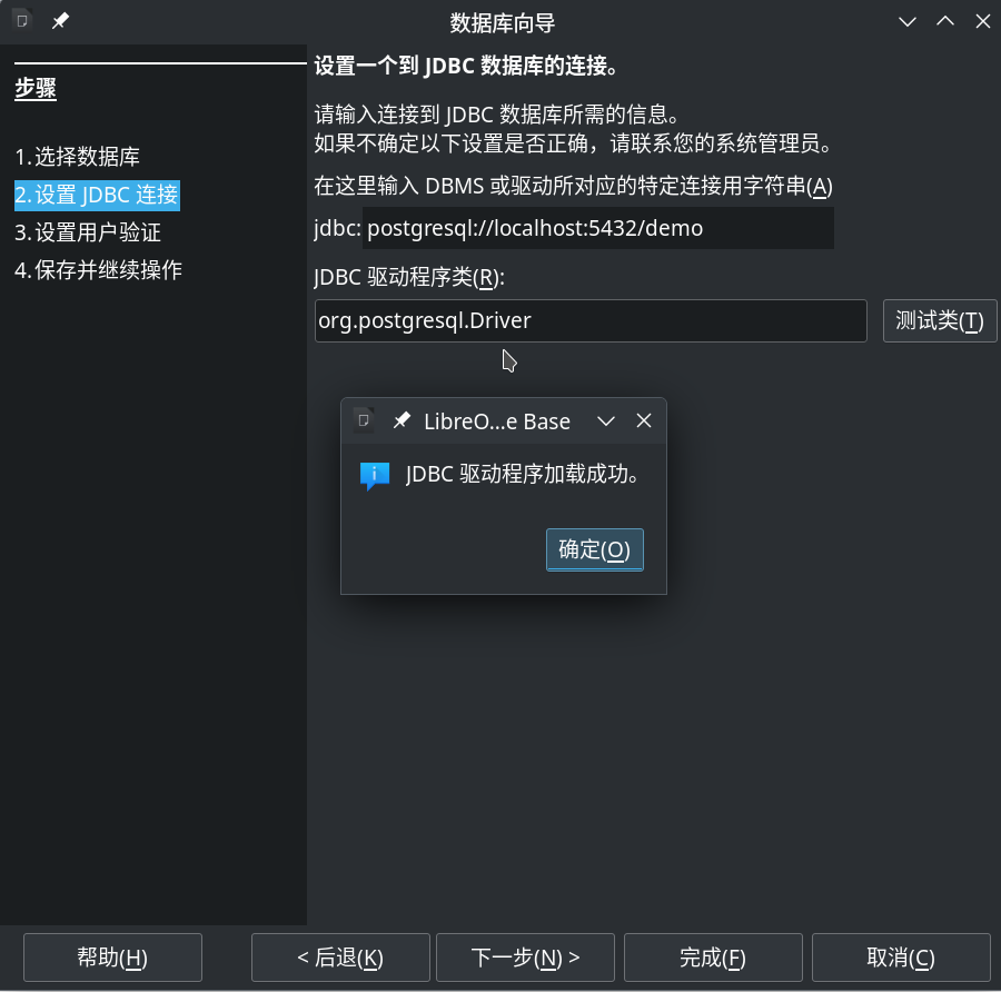 在JDBC连接界面,“在这里输入DBMS或驱动所对应的特定连接用字符串”输入相应URL,在“JDBC驱动类”输入PostgreSQL驱动类,之后点击【测试类】来测试JDBC是否能够正常使用。如果JBDC没有问题,则会显示如图所示的成功信息: