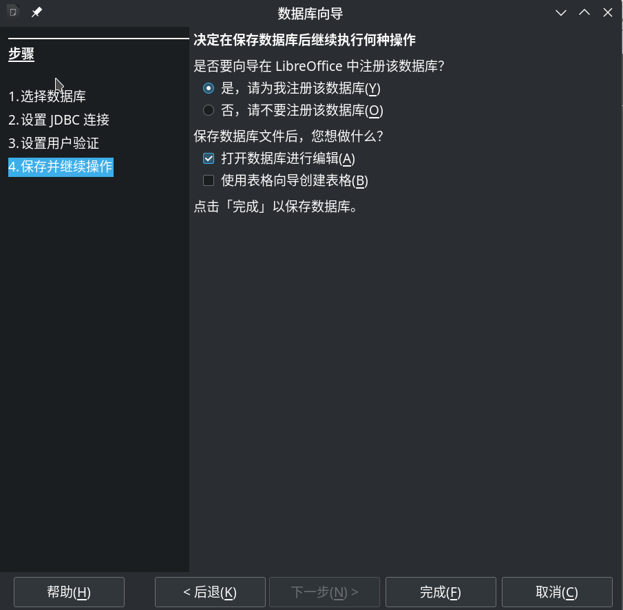 如果后续仍有通过LibreOffice Base连接该数据库的需要,可以考虑“注册该数据库”来保存相应设置。勾选“注册该数据库”后选择一个合适的路径来存放要保存的odb文件。
