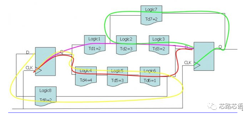 对于紫色路径:Td=Tcell+Td1+Td2+Td3=1+2+3+2=8