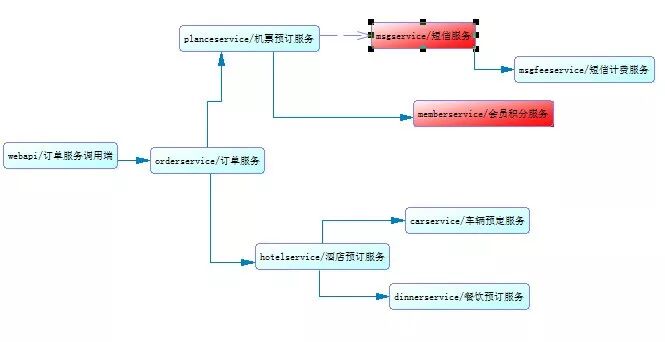 线则是异步rpc调用,整个调用链路从webapi开始到dinnerservice结束,红色节点则表示该服务不可用或高延迟,异步调用msgservice异常对链路返回结果并无影响,而同步调用(memberservice服务)的性能对链路则有很大影响,其会造成链路上planeservice、orderservice及webapi服务堵住,堵着的请求会耗费线程及io资源,随着此类请求越来越多,特别是在流量高峰时,如果不能及时解决memberservice的问题,最终将把整条链路堵死,造成webapi不能对外提供服务,提供崩溃,这就是所谓的雪崩效应。