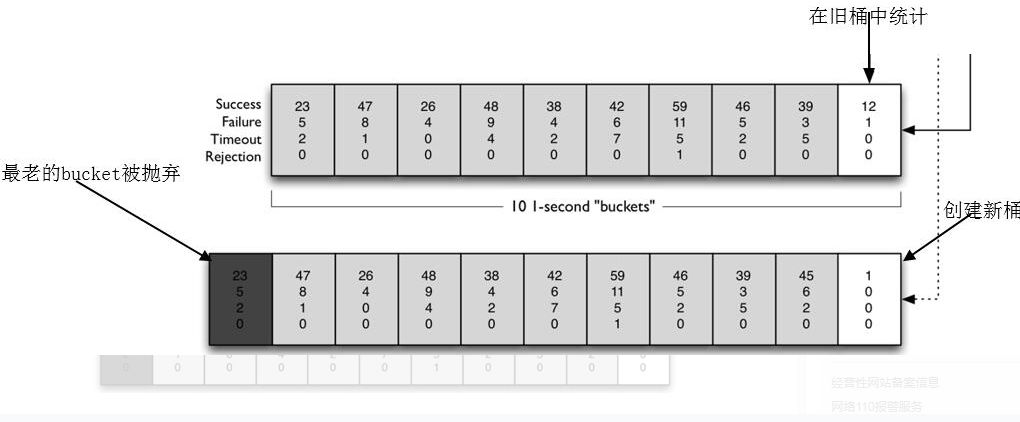 第一,熔断请求判断算法即熔断在什么条件处于开启状态,什么条件处于关闭或半关闭状态。使用滑动时间窗口来记录每个时间片内相关熔断计数指标及熔断器状态,这个时间片段称作为一个bucket,默认维护10个bucket,每1秒一个bucket,随着时间的滚动,最早的bucket抛弃,创建新的bucket到滑动窗口右边。每个blucket记录请求总数、成功数、超时数、拒绝数及熔断器状态,默认错误超过50%且10秒内超过20个请求进行中断拦截。