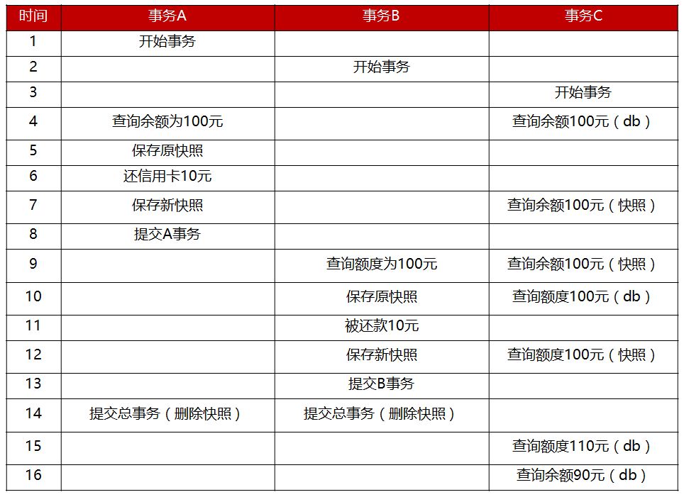 拿信用卡还款来说,一致性就是还款成功前和还款后银行卡余额加上信用额度是相等的。
