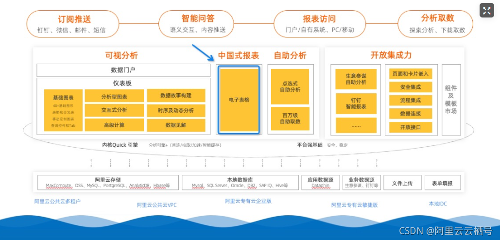 Quick BI电子表格,沿袭类Excel在线设计器的交互,学习成本低,上手快。支持在线导入、导出Excel,具备快捷自定义函数计算能力,支持多种数据源连接以及拥有自由式表格的能力。报表编辑、预览、导出均受权限管控,保障数据安全的同时,降低报表维护成本。