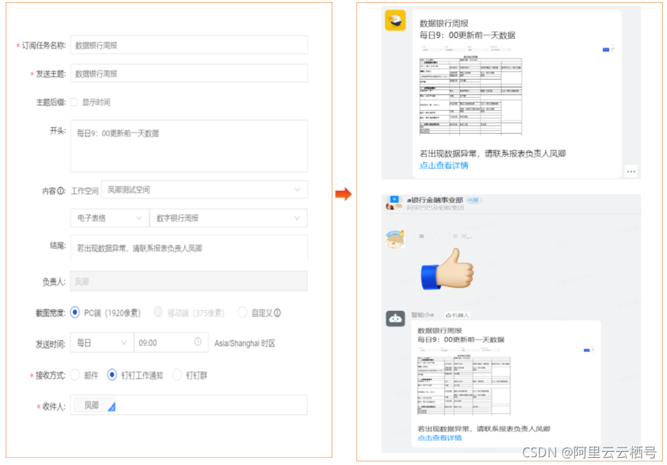 从日常业务分析报表、周报报表,到绩效考核报表以及复杂的监管类报表,用户可结合业务需求任意DIY。为更好的加快数据在企业内的有效流通,Quick BI电子表格可与订阅功能组合应用,通过邮件、钉钉通知、钉钉群等渠道定时推送数据报告,帮助大家及时感知业务问题,提升数据驱动决策的效率。