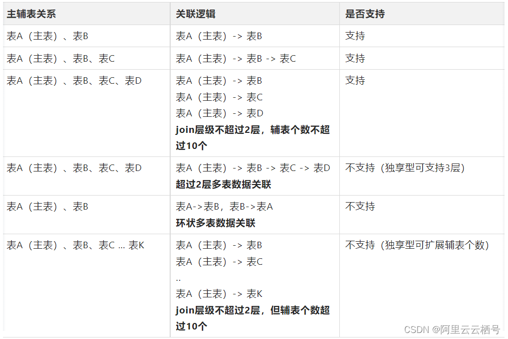 接入开放搜索前,需要预先设计好表结构(可单表,可多表join),以便后期应对各种搜索业务场景和数据推送场景。目前开放搜索支持的多表场景如下: