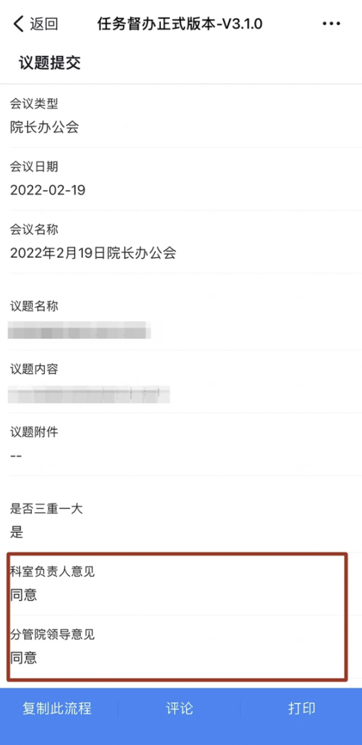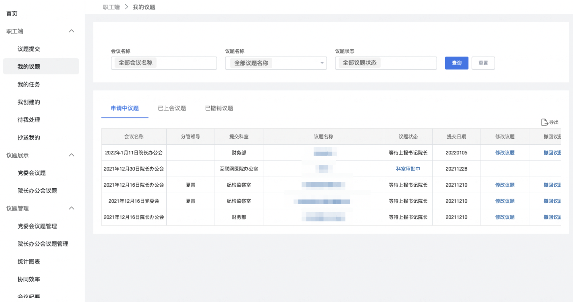"两会"高效协同:系统支持院长办公会和党委会"两会"议题间的联动,在议题提交上即可选择两会联动,在议题经过会议讨论后,会议结果也可以进行联动同步,增强了医院"两会"决策机构间的线上联动通道。