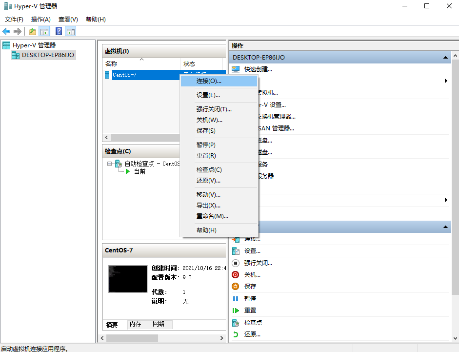 如下图所示案例中右键点击虚拟机,选择“连接”即可进入虚拟机管理页面。