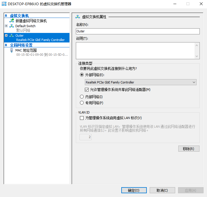 选中网络适配器,将虚拟交换机(S)设置为外部网络交换机对应的名称选项。