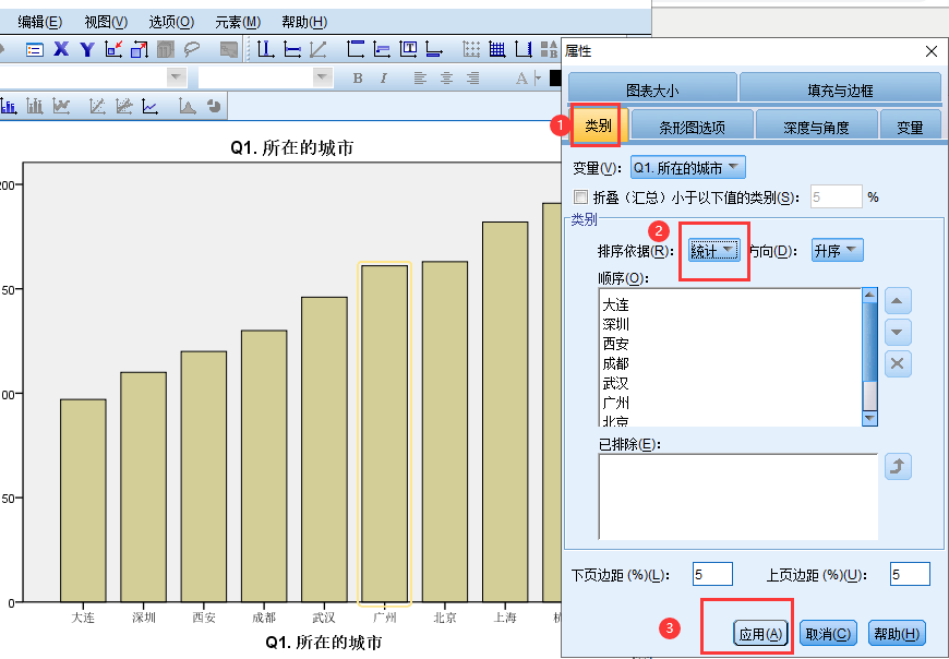上述所在城市的条形图,展示参差不齐。我们需要的是按城市出现的频率高低来排序。