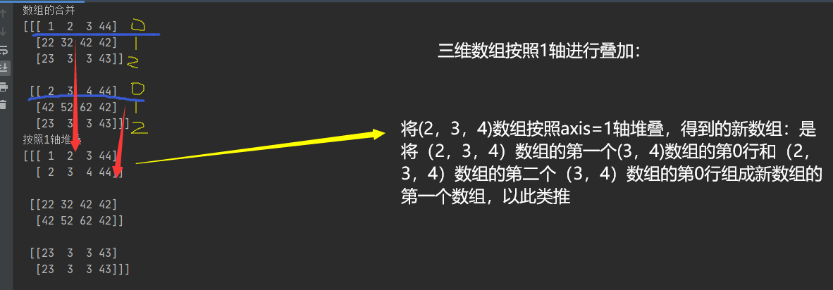 (2,3,4)数组按照axis=1轴进行堆叠: