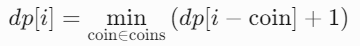 coin <= i且dp[i-coin]可达(非初始值),则更新:dp[i] = min(dp[i], dp[i-coin] + 1)