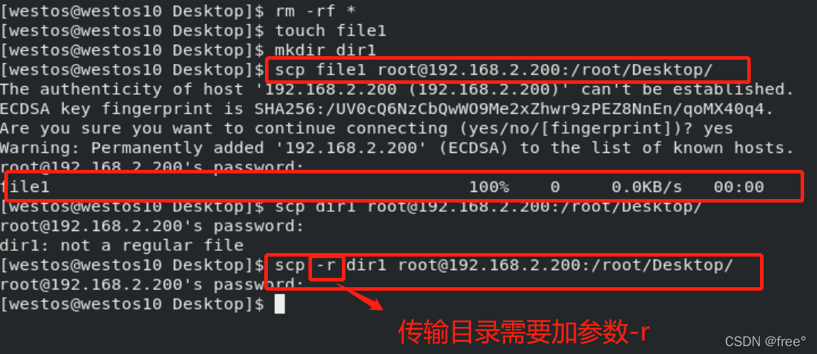 scp -r dir root@192.168.2.200:/root/Desktop/ -r 表示复制目录