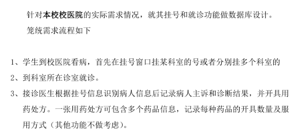 根据功能是需要实现学生在校医院中挂号就诊的过程,可以确定该需求中的实体有学生、科室,则实体与联系为: