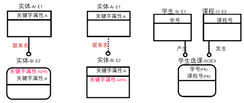 一对一联系:可以将任一方主码纳入到另一方中,具体如何选择需要参考需求。