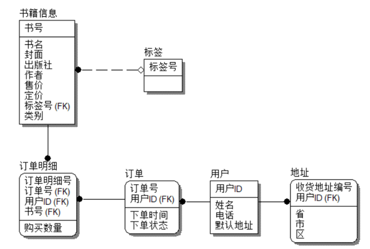订单明细与订单之间、与书之间均为“1对1”的关系,则:订单明细(订单明细号,书号,购买数量);