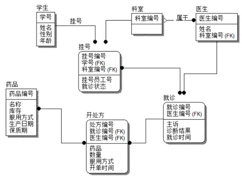 就诊(就诊编号,学生,医生,主诉,诊断结果,就诊时间);