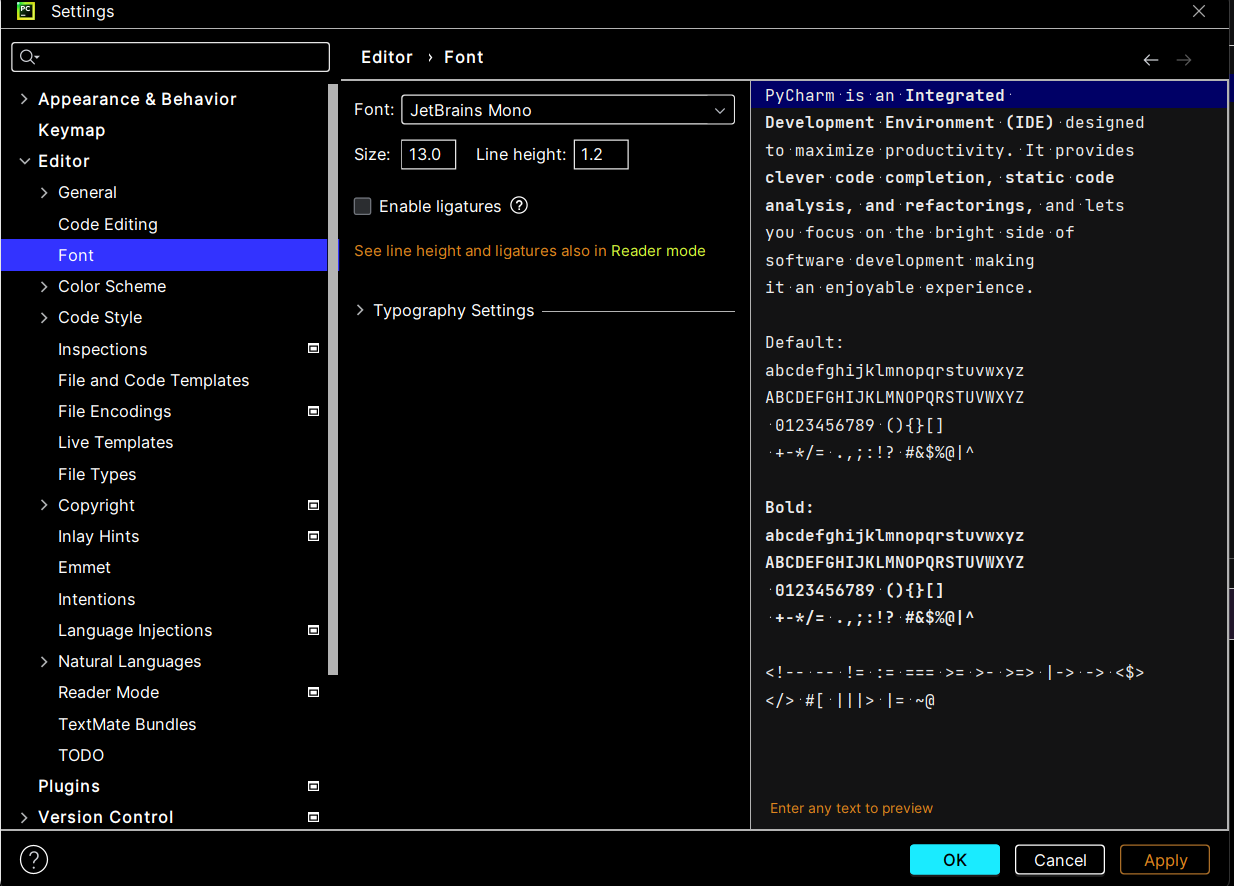 2.修改默认字体:同样点击右上方齿轮状按钮进入“Settings”,在“Editor”下方“Front”中进入字体样式与大小,在右侧可以查看预览效果。