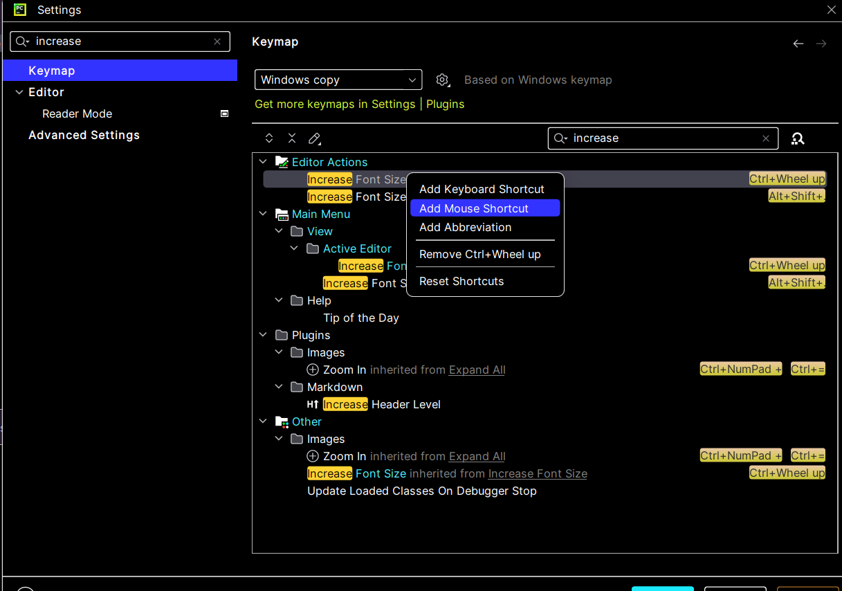 同样先进入“Settings”界面,搜索“increase”,选择第一个,右键添加鼠标快捷键
