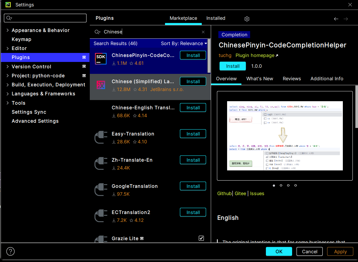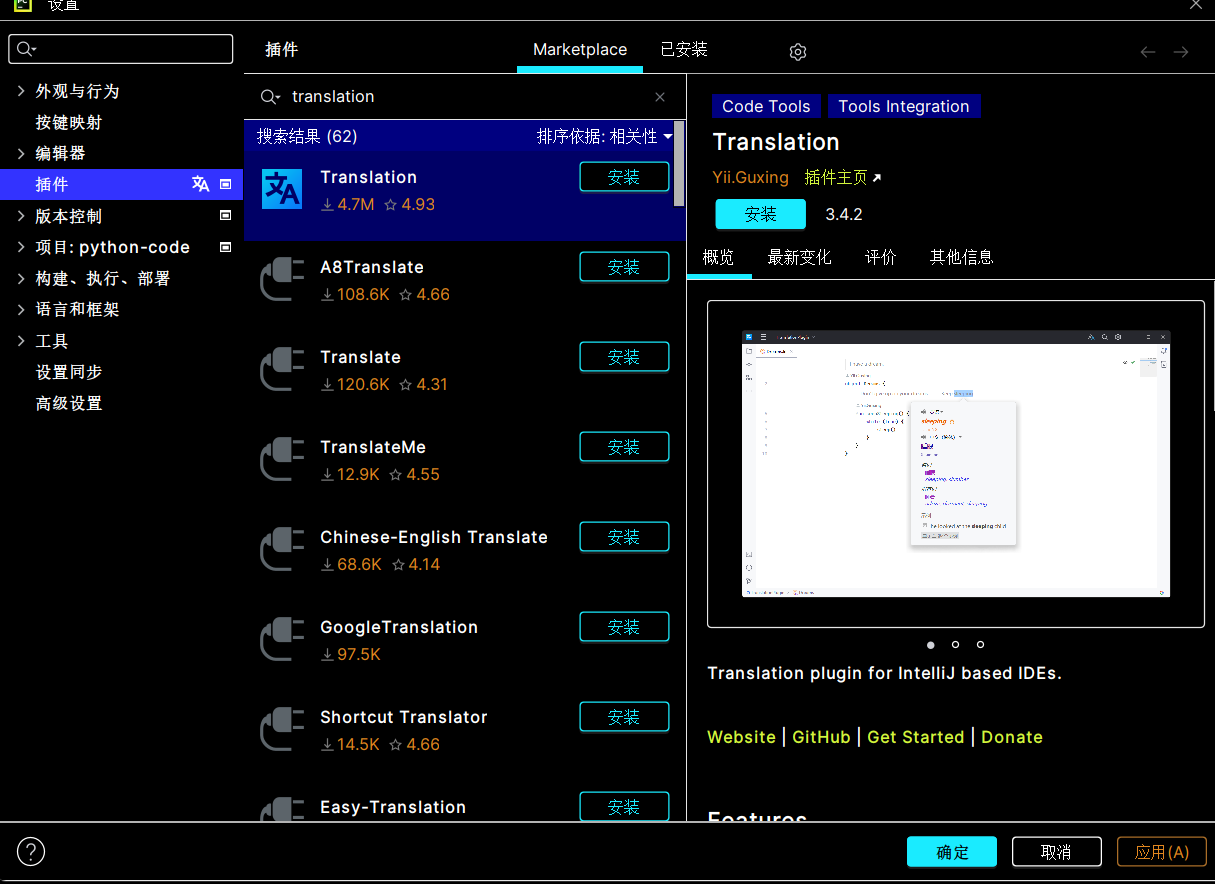 同样也可以在此界面安装翻译插件,便于以后查看别人的代码;