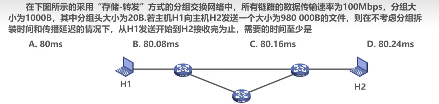 报文数目n = 980000 / (1000 - 20)= 1000个,则总时延 = (1000 - 1 + 3)* 1000B/100Mbps = 1002*8*10^(-5) = 8016 * 10^(-5)= 80.16ms