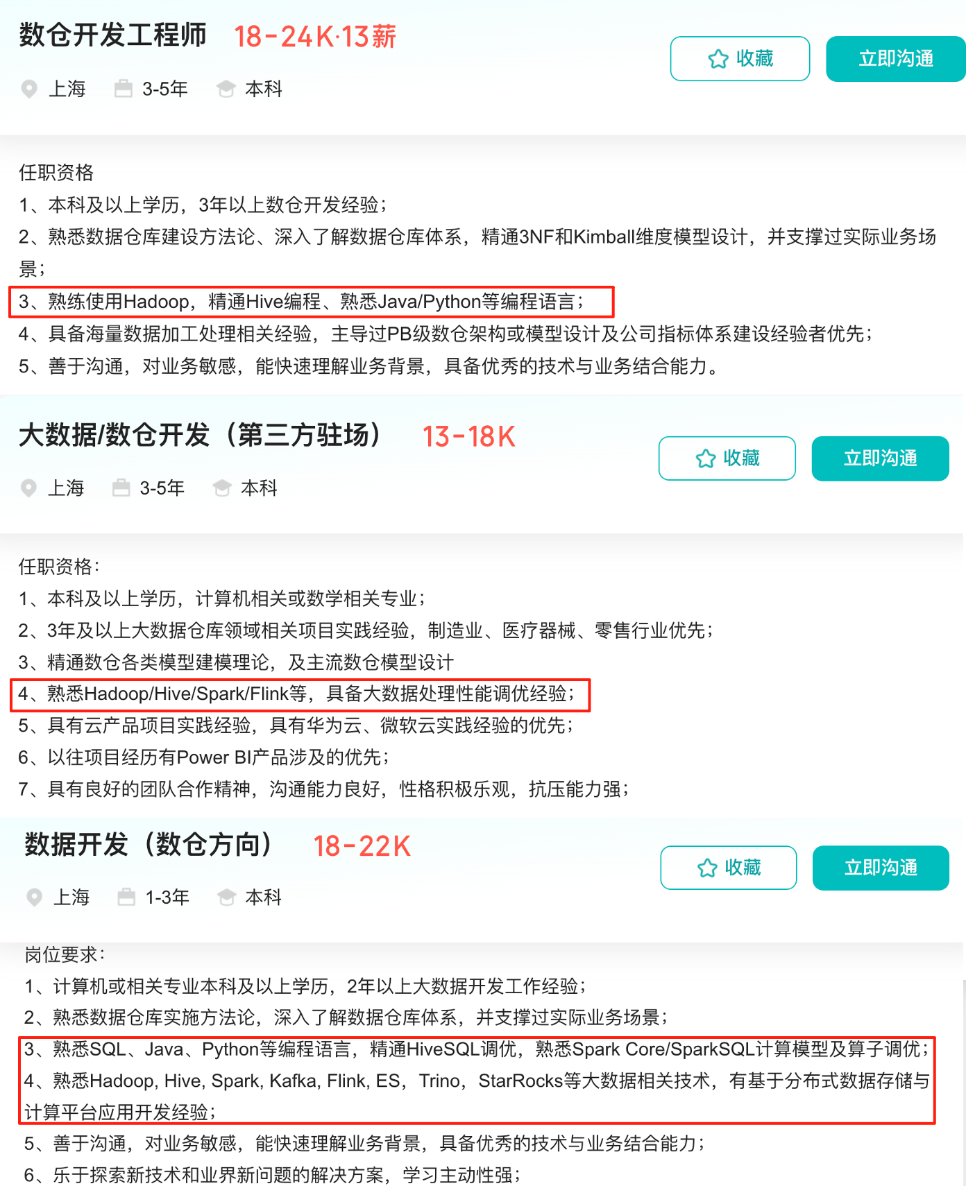 去网上找一份 20 - 30k 的大数据开发的简历、或者招聘网站上看一些 20 - 30k 的岗位要求,了解目前数仓开发的核心技术栈,从而知道自己要补充哪些技术知识。举一些例子,你会发现市面上大多数数仓开发工程师都要熟悉 Java / Python 编程语言、Hadoop 分布式系统基础架构、Hive/Spark/Flink 等数据开发工具和框架,有些还要求熟悉 Kafka 数据接入。