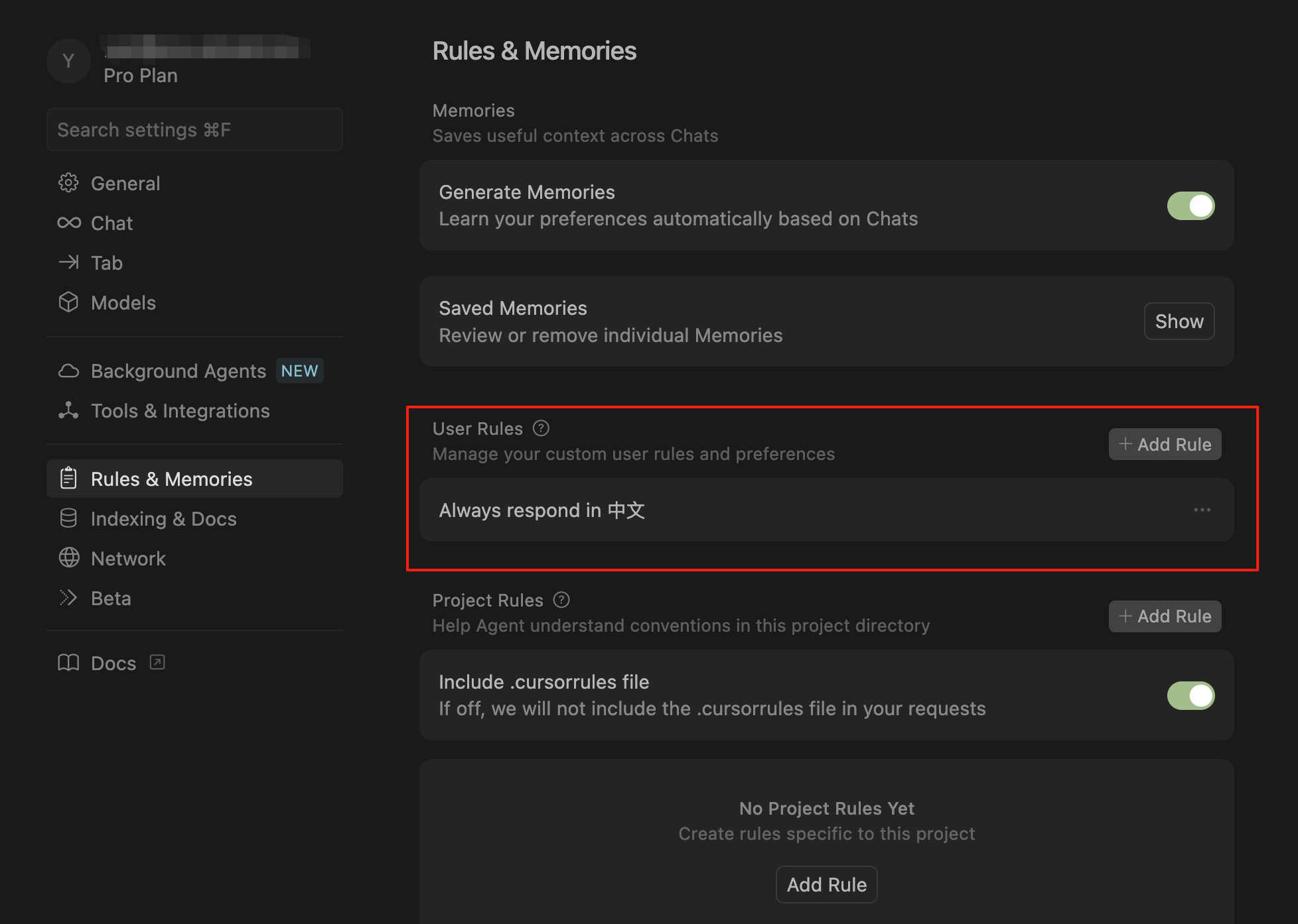 5)如果你使用的是 Cursor,可以设置 Rules 规则来约束 AI。比如觉得 AI 成本太高、或者生成太慢,可以在提示词中引导 AI 直接输出源码,不用给出总结和解释过程。