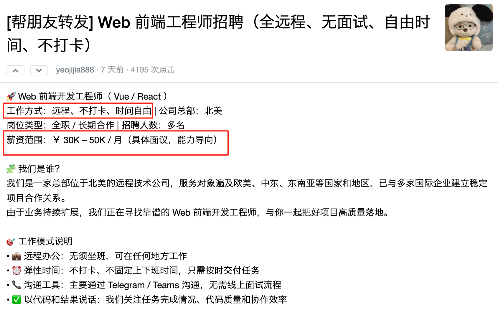 好家伙,全远程、无面试、自由时间、不打卡?月薪 30 - 50K?