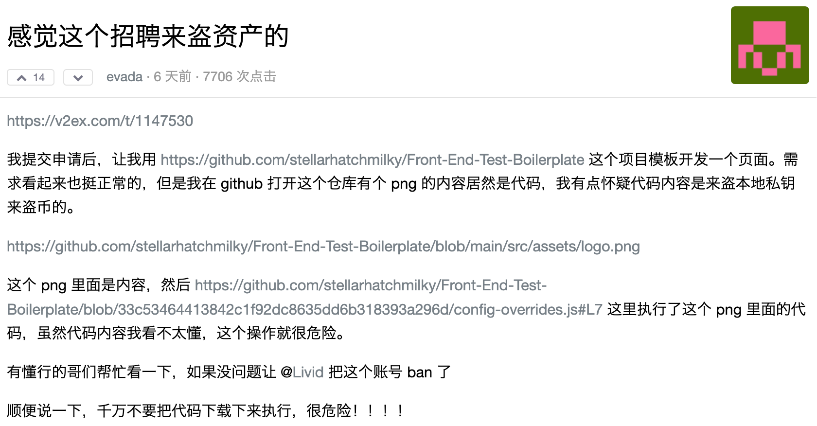 有朋友提交了申请后,对方让他用一个项目模板开发页面,而项目模板中,竟然暗藏了疑似盗取加密货币的恶意代码!
