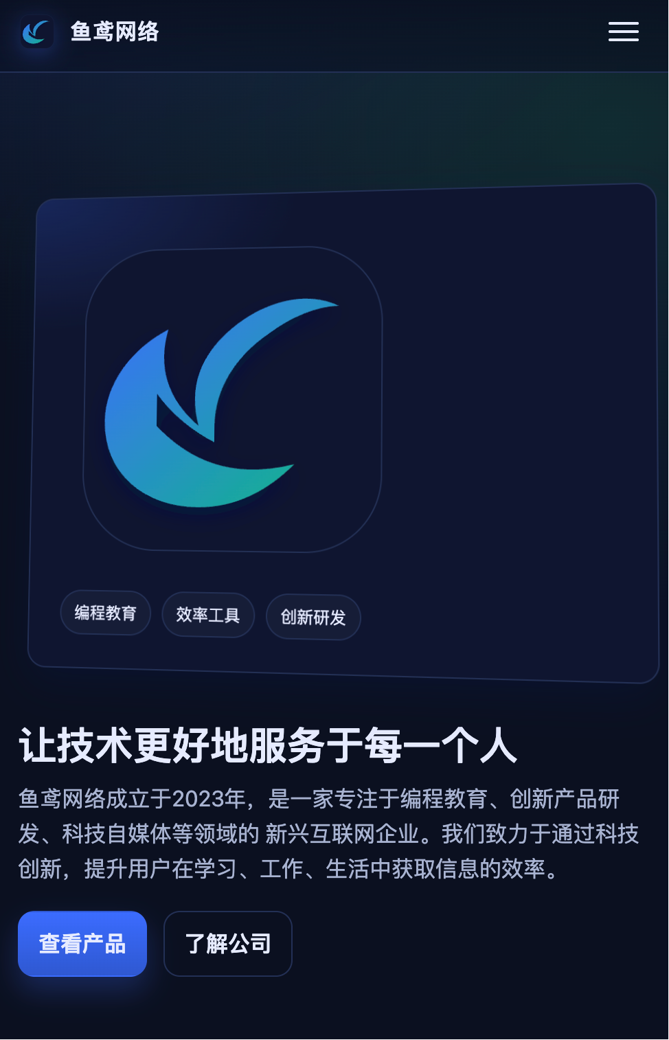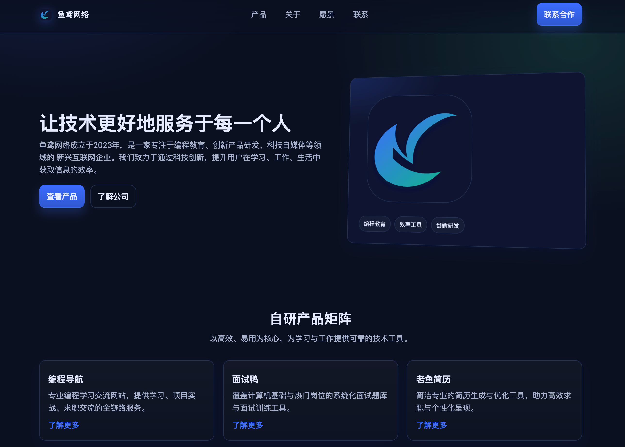 在我没有指定配色方案的时候,AI 针对我们公司的类型,自动匹配了这样一套深色风格的设计,我觉得还是挺不错的。