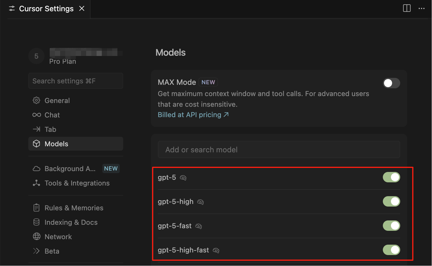 首先进入 Cursor 设置,把 GPT-5 的模型都选上: