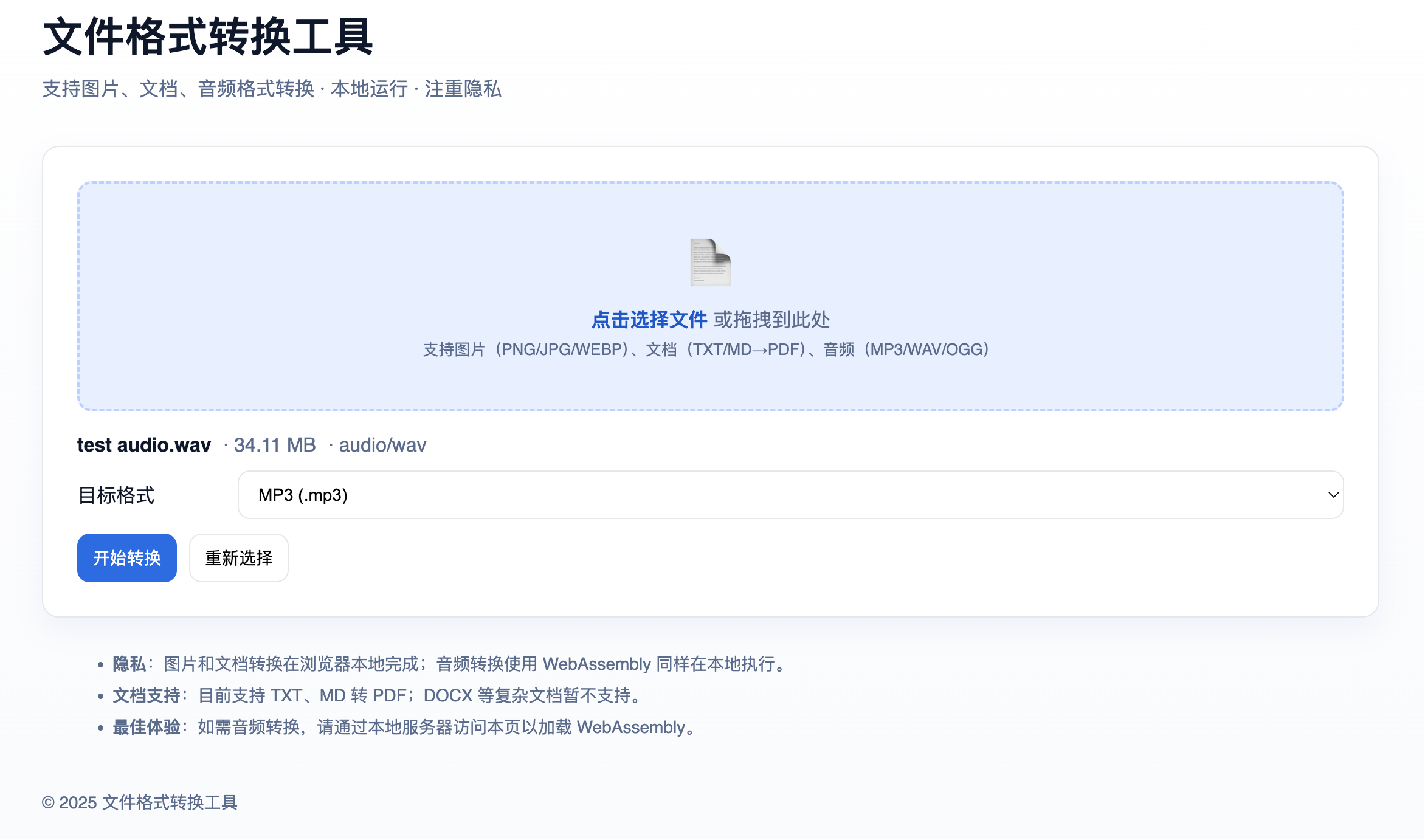 再看一下 GPT-5 的生成效果,其实样式上跟 Claude 生成的区别不大,但是它是真的能进行音频、PDF 文档的转换!不像之前 Claude 生成的转换工具,可能只是改了个文件后缀。