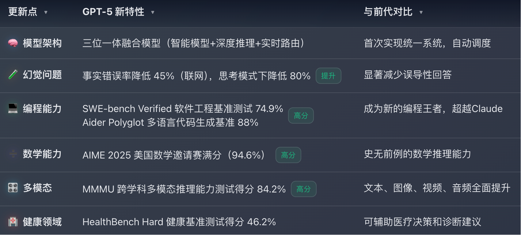 | GPT-5 | 统一智能系统:包含智能模型+深度推理模型+实时路由器,自动决定何时启用深度思考 |