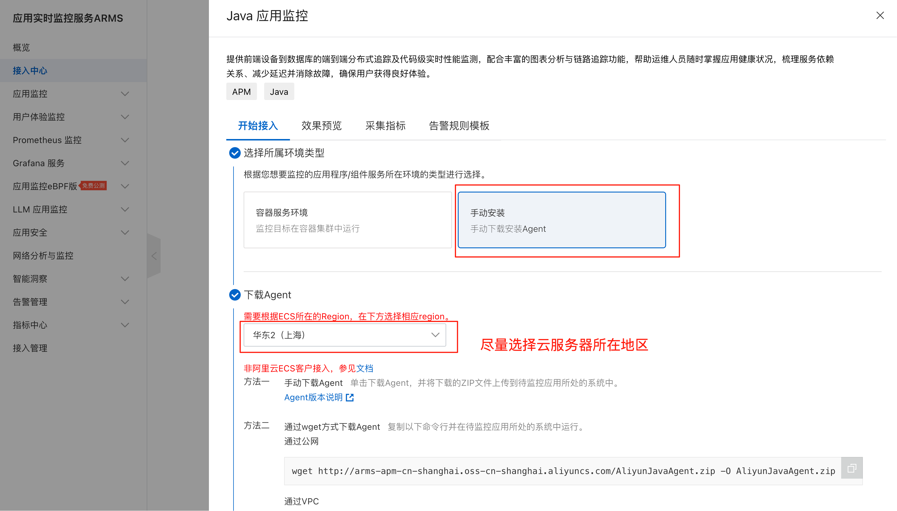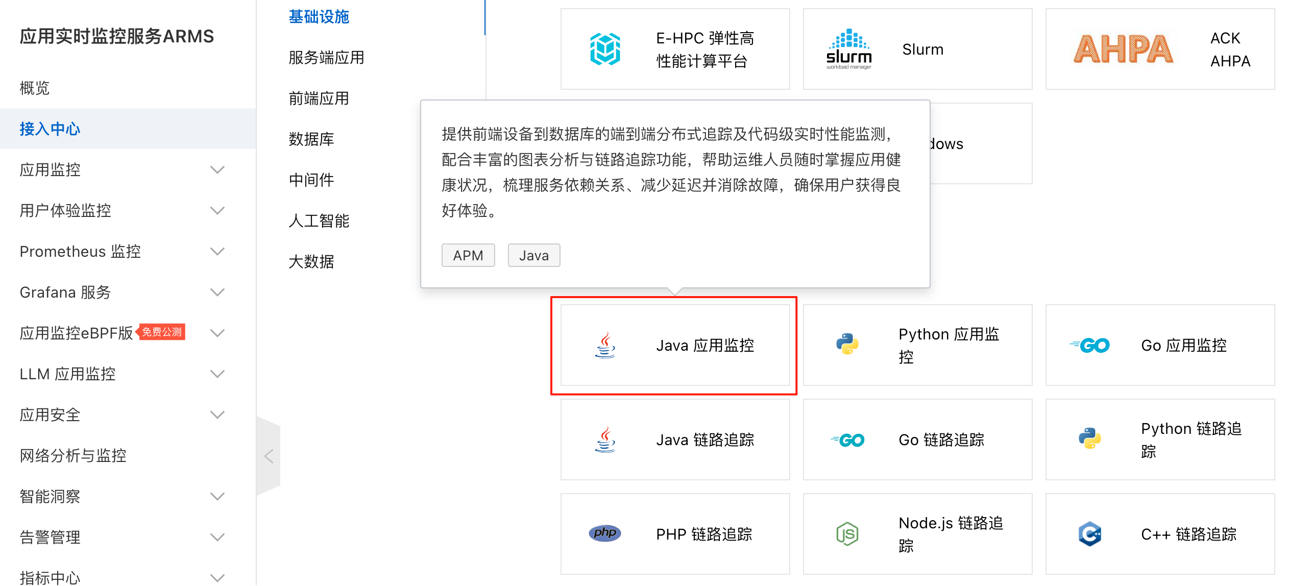 进入接入中心,选择 Java 应用监控: